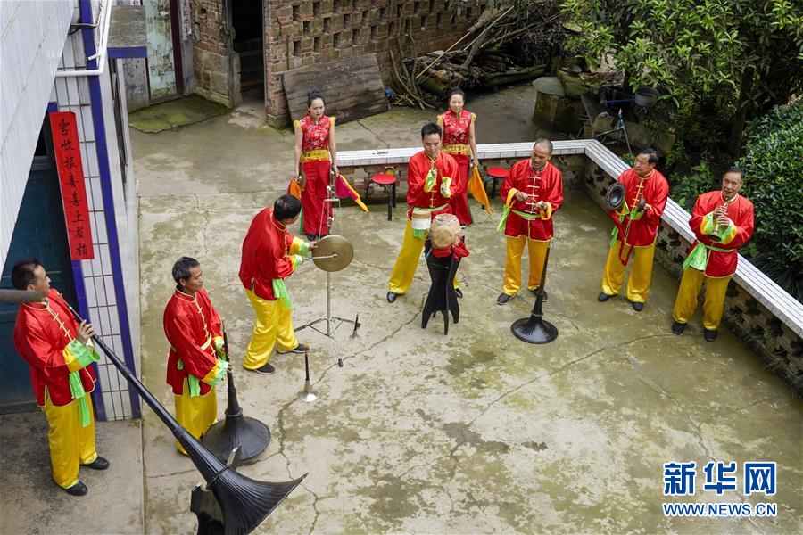 4月21日,永城吹打国家级非遗代表性传承人刘道荣(右一)作为班主带着刘家乐班的成员们在院坝里进行排练。每逢过年过节,重庆綦江的国家级非物质文化遗产——永城吹打就会在镇街上演。永城吹打最初是流传于綦江永城镇一带的民间器乐,表演者有的演奏一米多长的大唢呐,有的负责敲鼓、打川钹,有的则吹奏低音唢呐。国家级非遗代表性传承人刘道荣年近八十,是演奏永城吹打的刘家乐班第十八代传人。他说,前些年农村人开始外出打工,乐班一度后继乏人。对此,綦江区通过政府购买文化服务等多种方式扶持永城吹打,并支持刘道荣于2011年成立永城吹打学校。刘道荣在外打工的女儿也回到家乡,成立永城吹打演艺公司。侄儿刘重辉更是在传统曲牌的基础上融入唱词,加入锣和川鼓。如今,綦江区拥有成规模的吹打乐班400多支,从业人员达到2000余人,成熟曲目近千首。新华社记者刘潺摄
