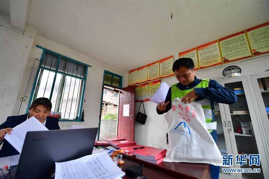 李义成(右)在办公室拿上扶贫材料,准备走访贫困户(4月20日摄)。新华社记者黄孝邦摄
