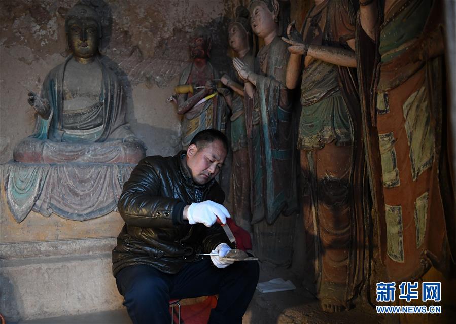12月25日,在麦积山石窟第11窟,修复师牟常有对塑像破损处进行加固处理。