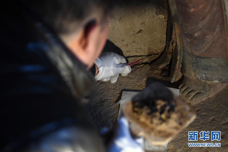 12月25日,在麦积山石窟第11窟,修复师牟常有对塑像破损处进行加固处理。新华社记者马宁摄