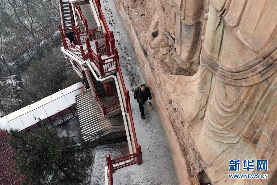 12月25日,在麦积山石窟,修复师牟常有走出石窟准备吃午饭。新华社记者马宁摄