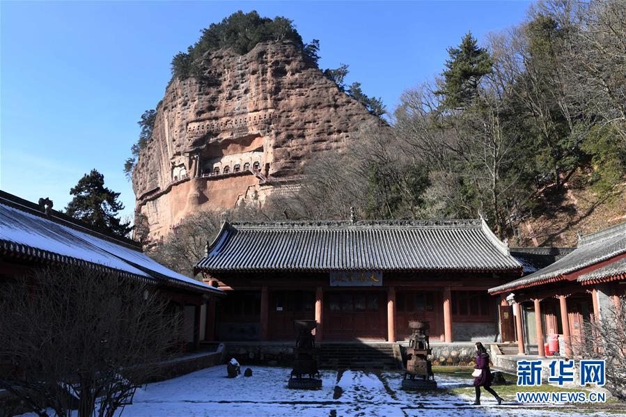 12月26日,游客在麦积山石窟参观游览。一场降雪过后,位于甘肃省天水市的麦积山石窟在晴空下尤为壮美。麦积山石窟是中国四大石窟之一,因其山形似麦垛而得名,现存窟龛221座。新华社记者马宁摄