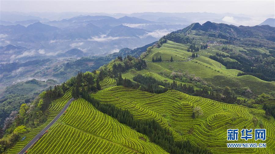 俯瞰鹿鸣茶海一角(4月28日无人机照片)。四川省珙县的鹿鸣茶海,常年云雾缭绕,茶垄依山分布,美不胜收。新华社记者江宏景摄