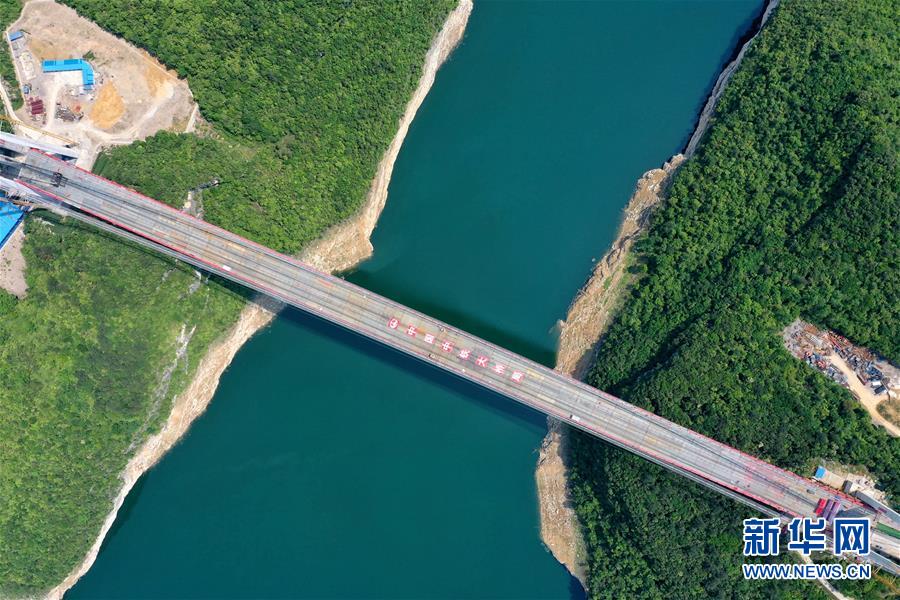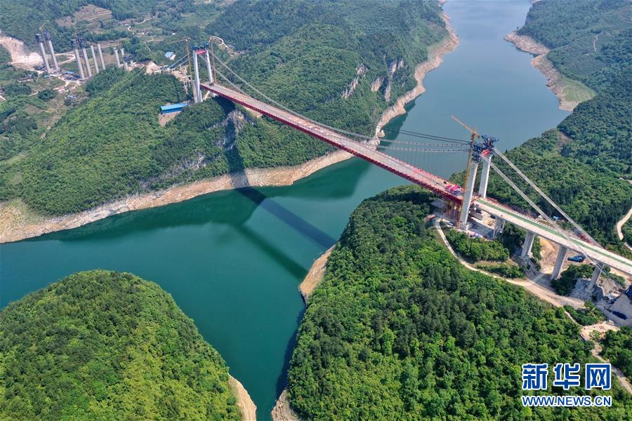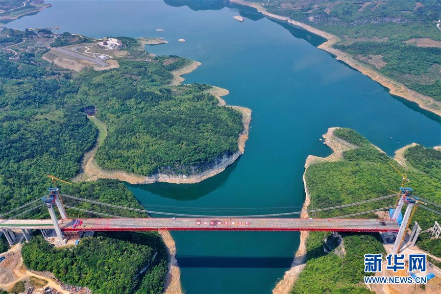合龙后的遵余高速飞龙湖乌江大桥(4月29日摄,无人机照片)。4月29日,由中铁大桥局承建的贵州遵余高速飞龙湖乌江大桥正式合龙。飞龙湖乌江大桥是遵余高速控制性工程,全长1.24公里,为主跨680米的钢桁梁悬索桥。新华社记者刘续摄