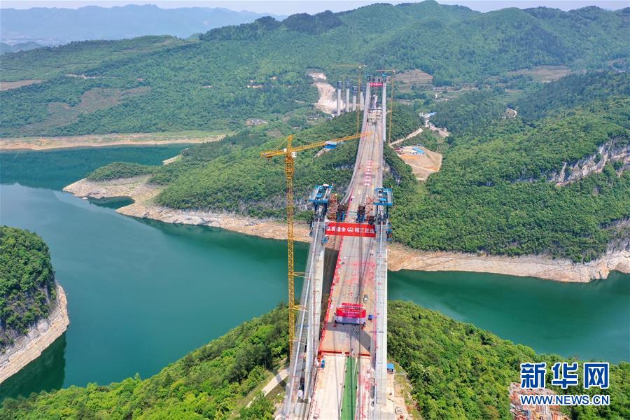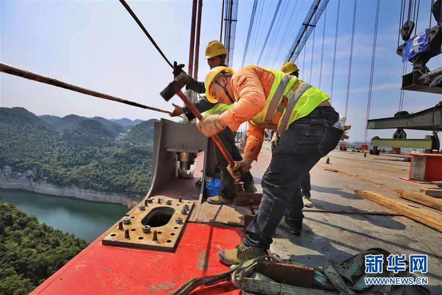 4月29日,中铁大桥局工作人员在进行合龙前最后的施工。当日,由中铁大桥局承建的贵州遵余高速飞龙湖乌江大桥正式合龙。飞龙湖乌江大桥是遵余高速控制性工程,全长1.24公里,为主跨680米的钢桁梁悬索桥。新华社记者刘续摄