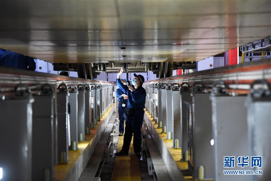 4月21日,中国铁路济南局集团公司青岛动车段临沂北动车所的工作人员在检查日兰高铁列车。新华社记者王凯摄
