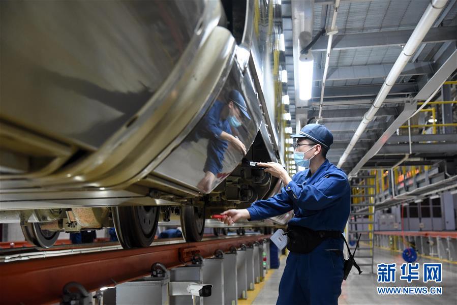 4月21日,中国铁路济南局集团公司青岛动车段临沂北动车所的工作人员在检查日兰高铁列车。新华社记者王凯摄