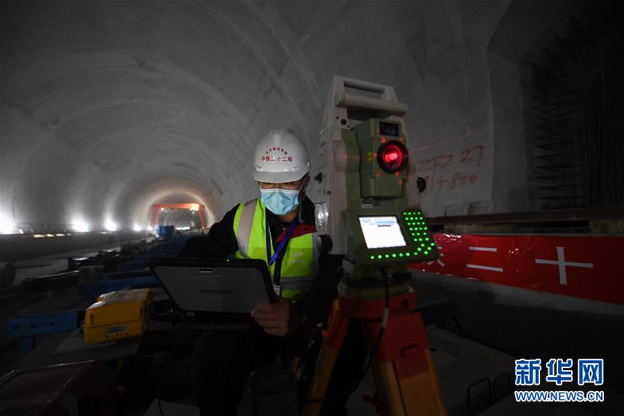 4月29日,在京沈高铁北京段巨各庄隧道施工现场,中铁二十二局施工人员在对铺设的轨道板进行精调作业。近日,在中铁二十二局集团承建的京沈高铁北京段管段内,施工方在做好疫情防控的同时,全力恢复生产。目前工程建设稳步推进,正在紧张进行高铁路基工程作业、高铁箱梁架设和轨道板铺设。新华社记者鞠焕宗摄