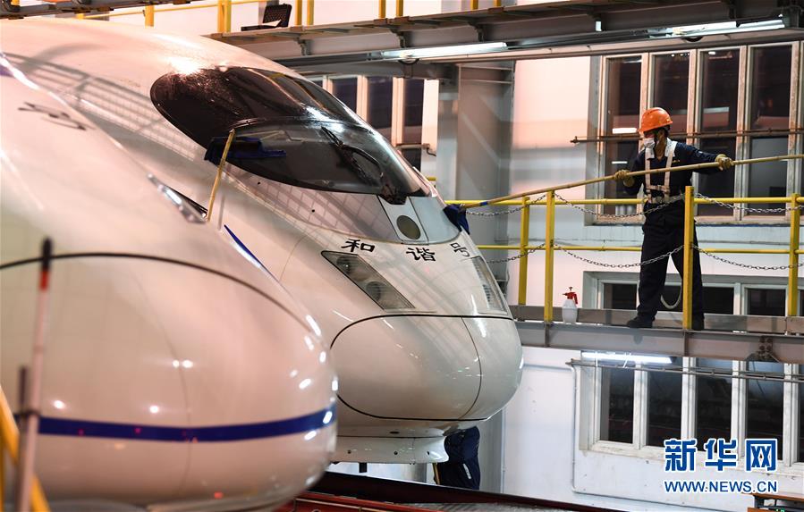 4月29日夜,工作人员在合肥南动车运用所内对动车组进行清洁。每当夜深人静的时候,合肥南动车运用所却灯火通明,“动车安全守护者”们坚守岗位,对动车组进行全面细致检修。新华社记者 刘军喜 摄