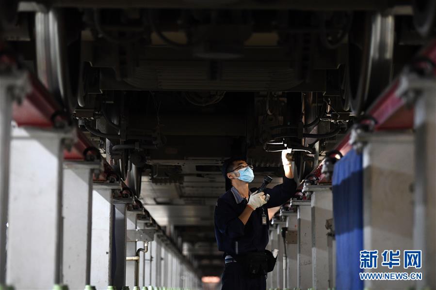 4月29日夜,合肥南动车运用所的工作人员对动车组进行检修。每当夜深人静的时候,合肥南动车运用所却灯火通明,“动车安全守护者”们坚守岗位,对动车组进行全面细致检修。新华社记者 刘军喜 摄