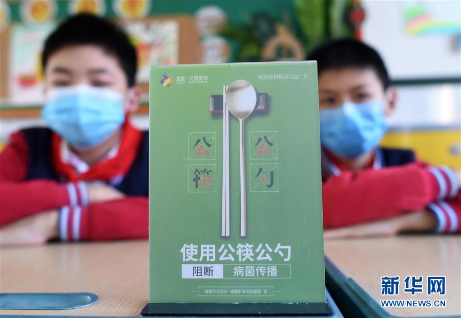 4月30日,诸暨市暨阳小学五年级4班学生在主题班会中。当日,浙江省诸暨市暨阳小学五年级4班开展“公筷公勺新家风”主题班会活动,通过海报设计、情景剧表演等强化孩子们使用公筷公勺的意识,倡导文明用餐。新华社记者 韩传号 摄
