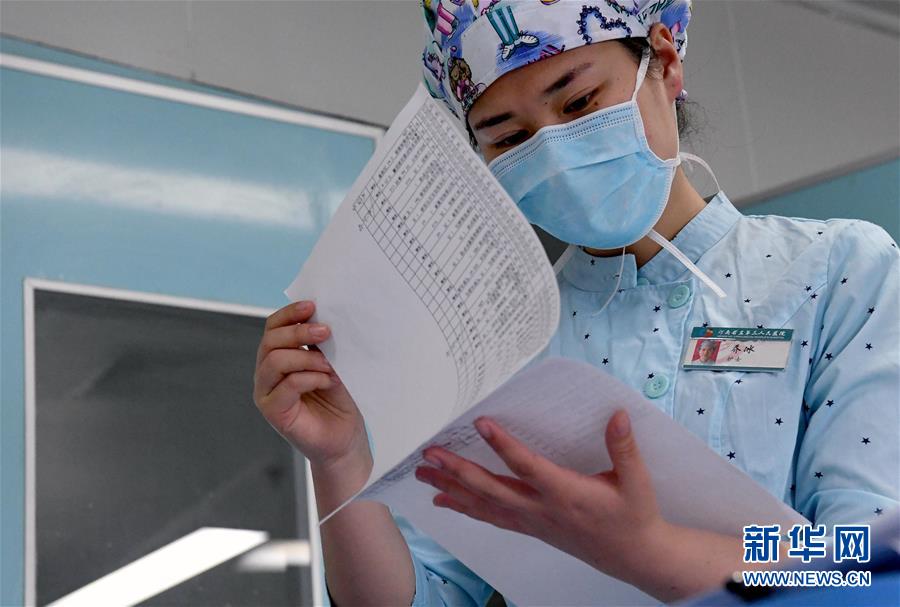 乔冰在河南省直第三人民医院急重症医学中心病房内翻阅医嘱(4月26日摄)。新华社记者李安摄