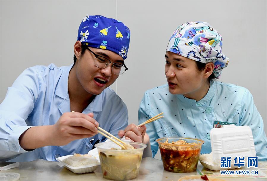 刘光耀(左)和乔冰一起吃午饭(4月26日摄)。新华社记者李安摄