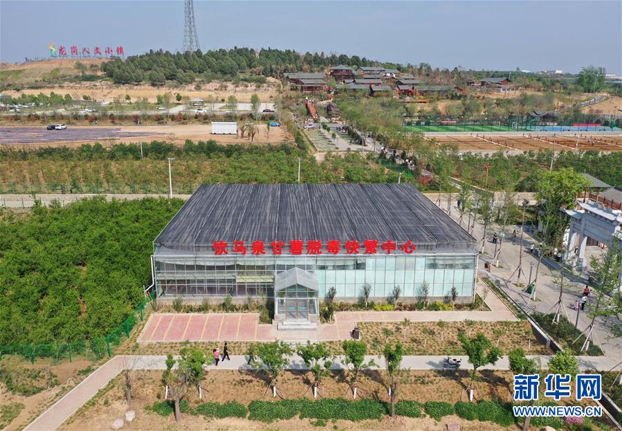 这是5月1日拍摄的河南省鹤壁市淇滨区钜桥镇岗坡村饮马泉甘薯脱毒快繁中心(无人机照片)。 新华社记者冯大鹏摄