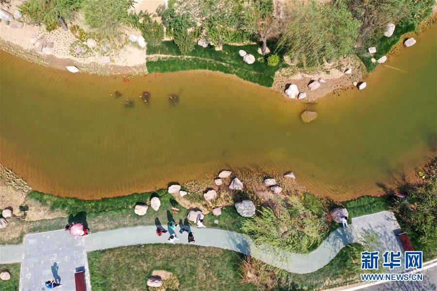 5月1日,游客在河南省鹤壁市淇滨区钜桥镇岗坡村的水系旁游玩(无人机照片)。 新华社记者冯大鹏摄