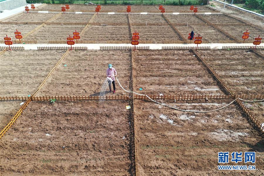 5月1日,村民在河南省鹤壁市淇滨区钜桥镇岗坡村共享菜园里浇水(无人机照片)。 新华社记者冯大鹏摄