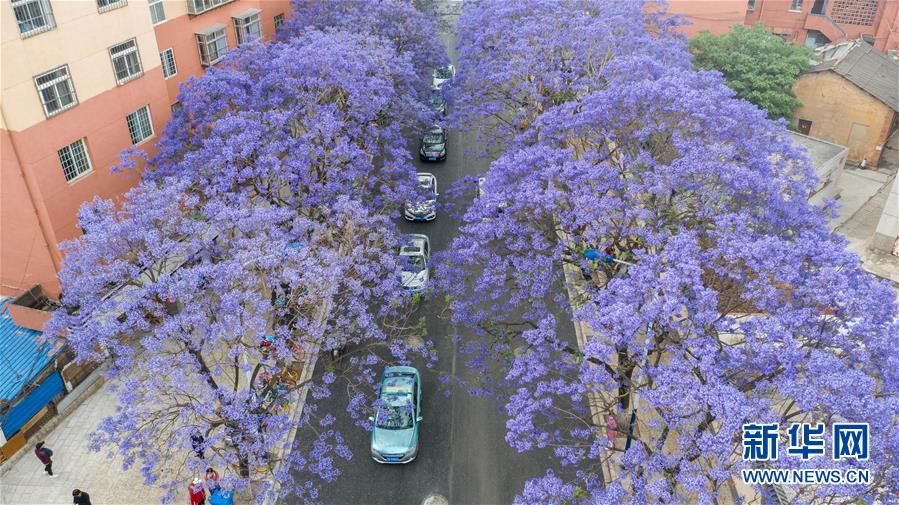 这是5月2日在昆明市教场中路拍摄的蓝花楹(无人机照片)。近日,云南省昆明市部分街区的蓝花楹竞相开放,为春城增添靓丽风景。新华社记者蔺以光摄