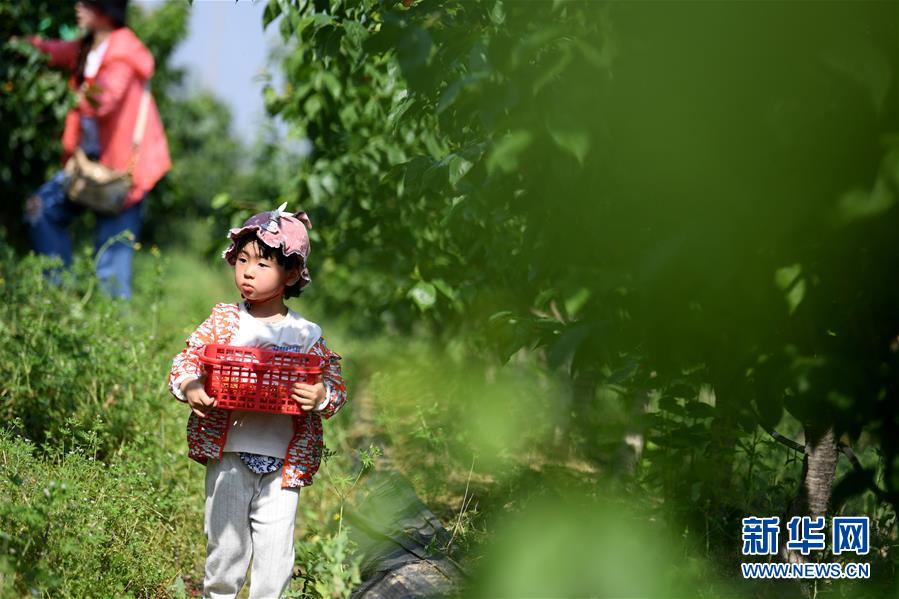 5月3日,游客在丰乐镇凤岭苗木种植扶贫产业园里体验采摘樱桃。新华社记者刘军喜摄