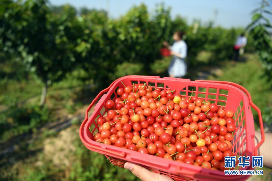 5月3日,农民在丰乐镇凤岭苗木种植扶贫产业园里采摘樱桃。新华社记者刘军喜摄
