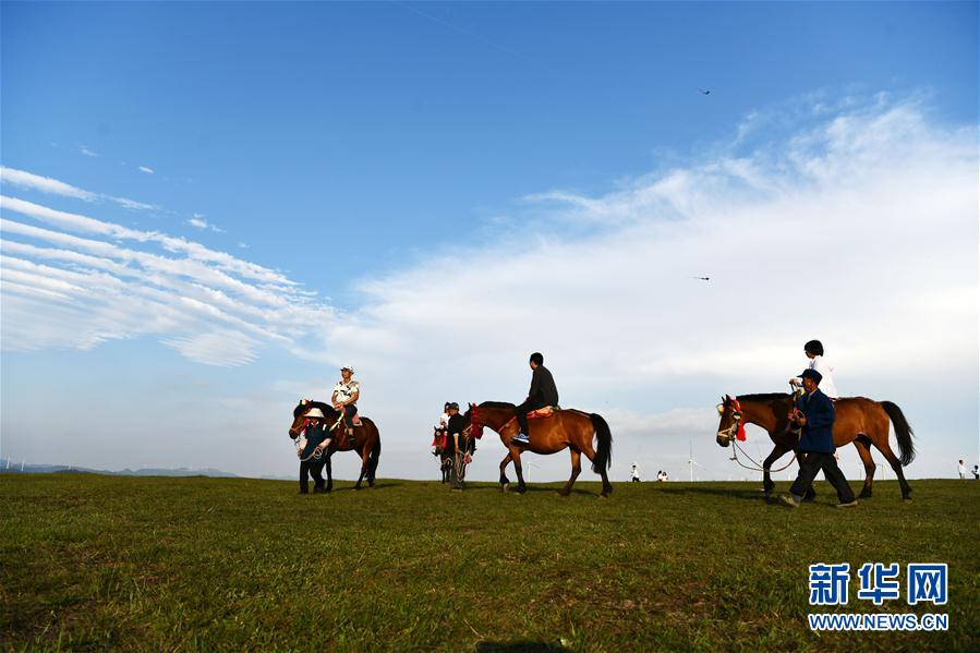 5月3日,游客在贵州省龙里大草原景区骑马观光。“五一”小长假期间,贵州省黔南布依族苗族自治州龙里大草原景区天气怡人,高山草原风光吸引游客前来游玩。新华社记者 杨文斌 摄