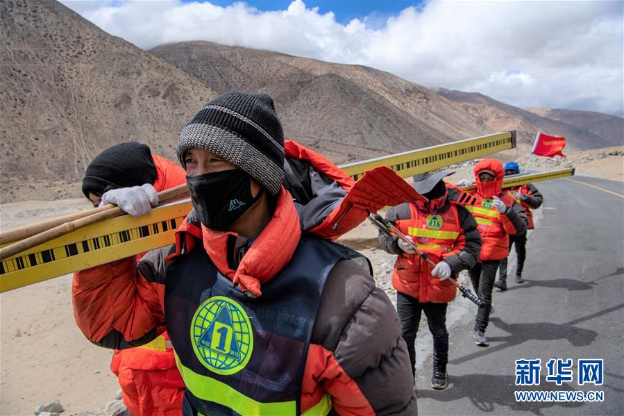 在西藏定日县曲当乡境内,国测一大队队员前往水准测量点(4月18日摄)。水准测量是一种利用提供水平视线的仪器(如水准仪、水准标尺),测定地面不同点之间的高差,并以此推算高度的一种方法,是经典大地测量的重要技术之一。在目前正在进行的2020珠峰高程测量中,部分国测一大队队员承担了水准测量的任务。新华社记者孙非摄