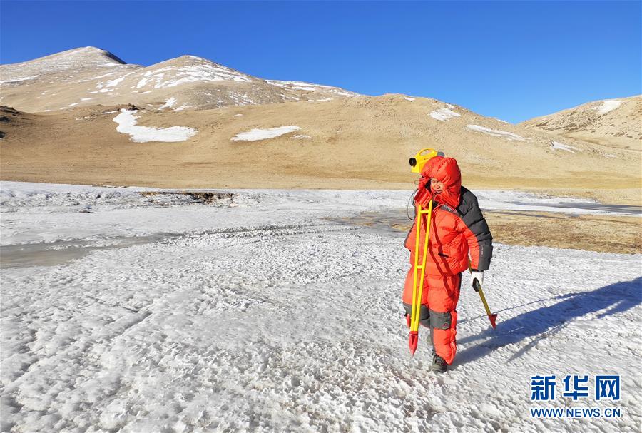 国测一大队队员霍申申在西藏定日县扎西宗乡境内进行水准测量(4月4日摄)。水准测量是一种利用提供水平视线的仪器(如水准仪、水准标尺),测定地面不同点之间的高差,并以此推算高度的一种方法,是经典大地测量的重要技术之一。在目前正在进行的2020珠峰高程测量中,部分国测一大队队员承担了水准测量的任务。新华社发(杨明摄)