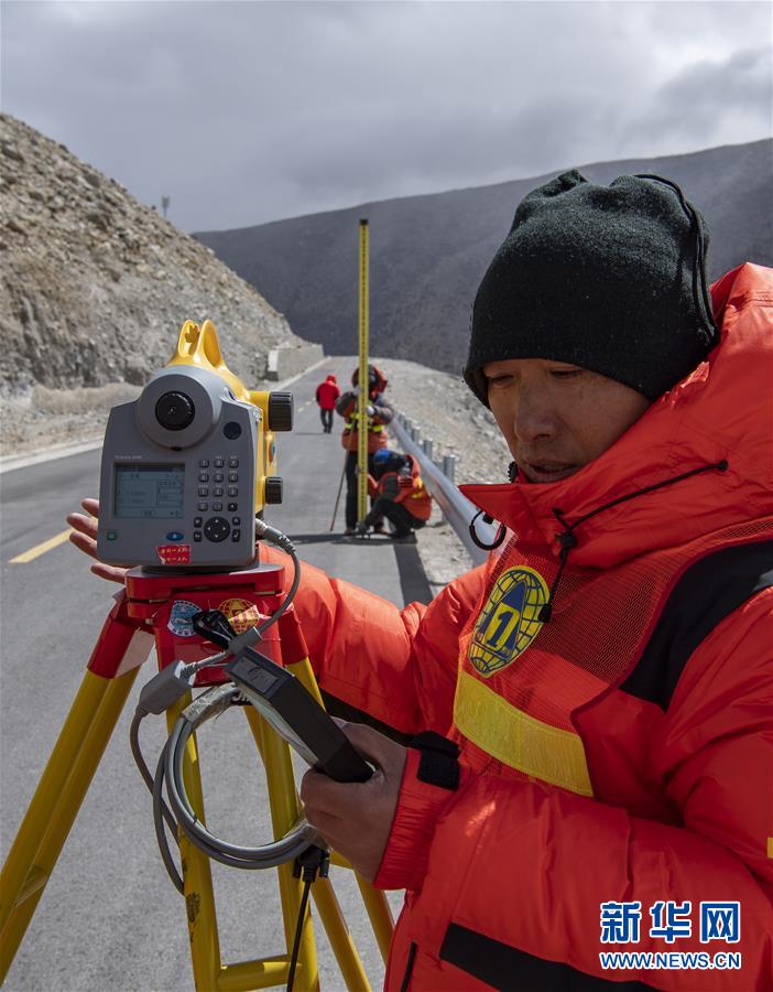 国测一大队队员金良在操作水准仪(4月18日摄)。水准测量是一种利用提供水平视线的仪器(如水准仪、水准标尺),测定地面不同点之间的高差,并以此推算高度的一种方法,是经典大地测量的重要技术之一。在目前正在进行的2020珠峰高程测量中,部分国测一大队队员承担了水准测量的任务。新华社记者晋美多吉摄