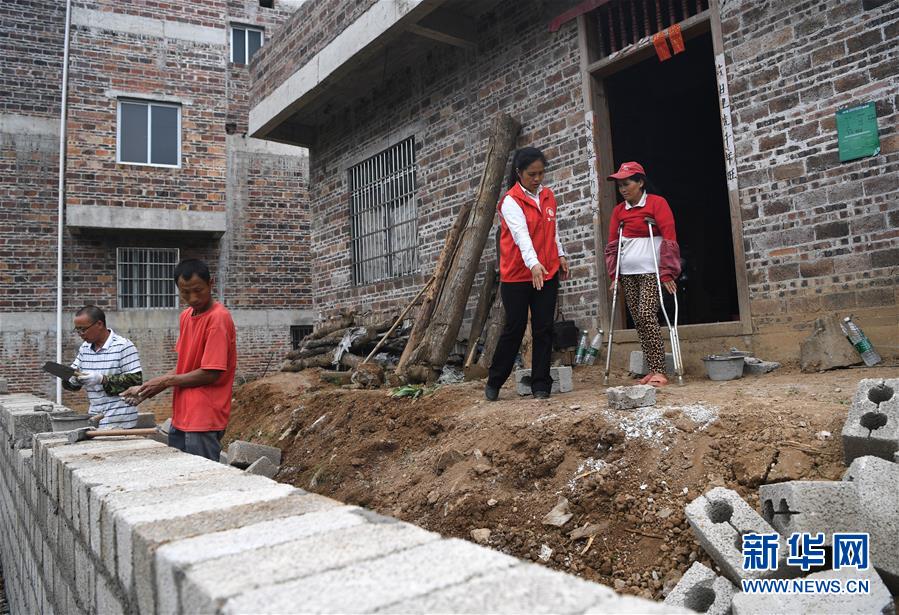 唐莉(右二)在平乐县张家镇老埠村贫困户陶仁桂家查看无障碍设施改造项目建设进展(5月4日摄)。新华社记者周华摄