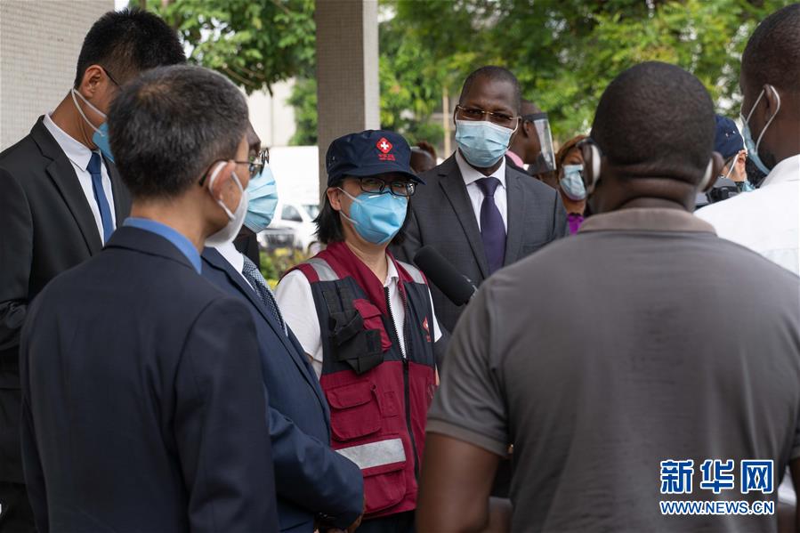 5月4日,在科特迪瓦经济首都阿比让,中国抗疫医疗专家组组长刘筠(中)接受采访。新华社记者郑扬子摄