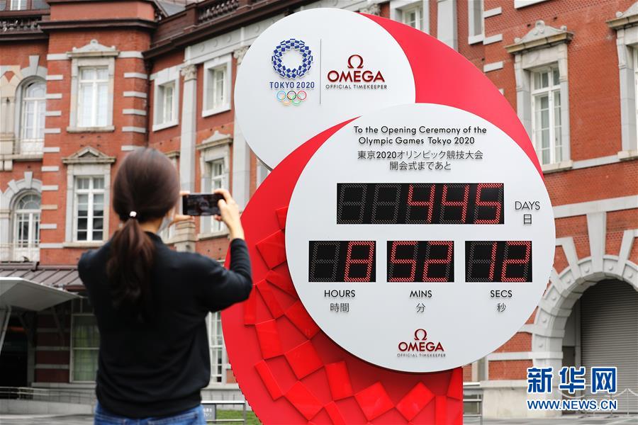 5月4日,一名女子在日本东京车站前拍摄东京奥运会的倒计时电子钟。新华社记者杜潇逸摄