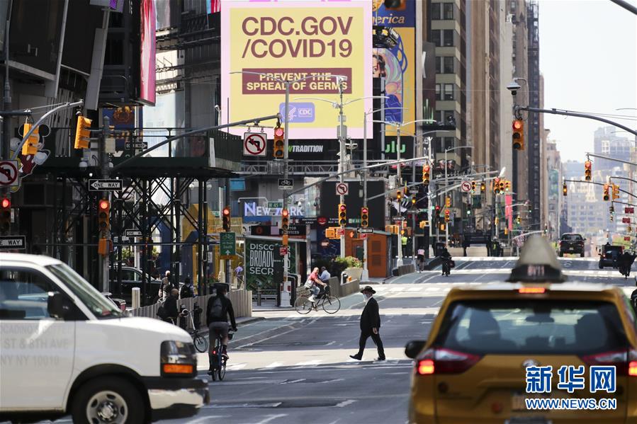 5月4日,美国纽约时报广场行人车辆稀少,液晶屏上显示新冠防控相关信息。新华社记者王迎摄