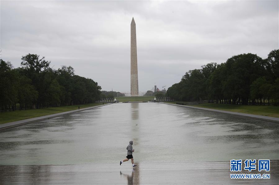 5月6日,在美国首都华盛顿,一名男子在华盛顿纪念碑附近跑步健身。美国自动数据处理公司(ADP)6日公布的数据显示,由于新冠疫情冲击美国经济和企业,4月美国私营部门大幅削减约2023.6万个就业岗位。新华社记者刘杰摄
