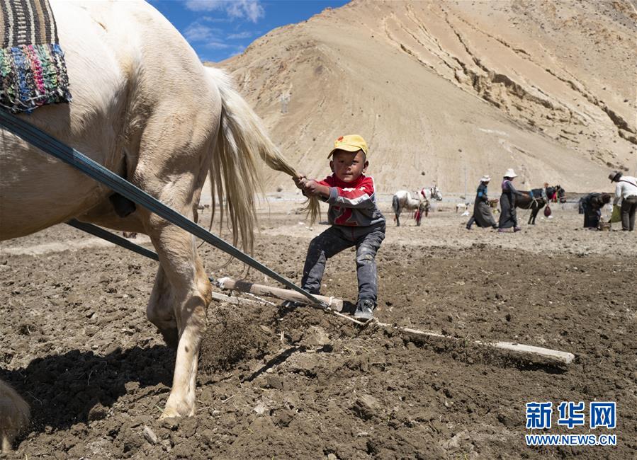 5月4日在西藏扎西宗乡拍摄的小旦多。受疫情影响,他所在的幼儿园还未复课,他便到田里帮父亲犁地。新华社记者普布扎西摄