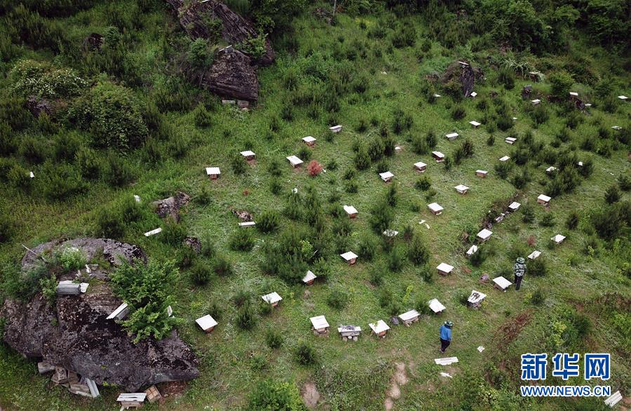 2020年5月3日,湖北省襄阳市,在南漳三道河水库小岛上,小岛养蜂人赵德海每天要巡视蜂箱,查看蜂箱的蜜蜂密集度和蜜蜂繁殖情况,及时调整,才能避免蜜蜂受损。
