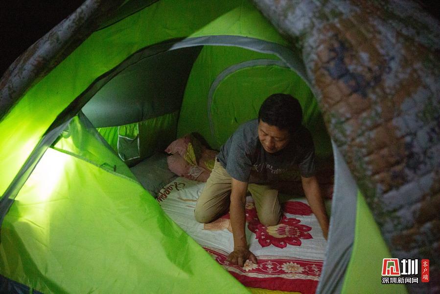 2020年5月3日,湖北省襄阳市,在南漳三道河水库小岛上,小岛养蜂人赵德海忙碌了一天,晚上收拾帐篷准备在岛上入睡。