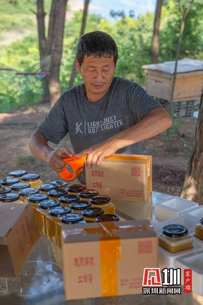 2020年5月3日,湖北省襄阳市,在南漳三道河水库小岛上,小岛养蜂人赵德海正在打包蜜蜂,准备发货。