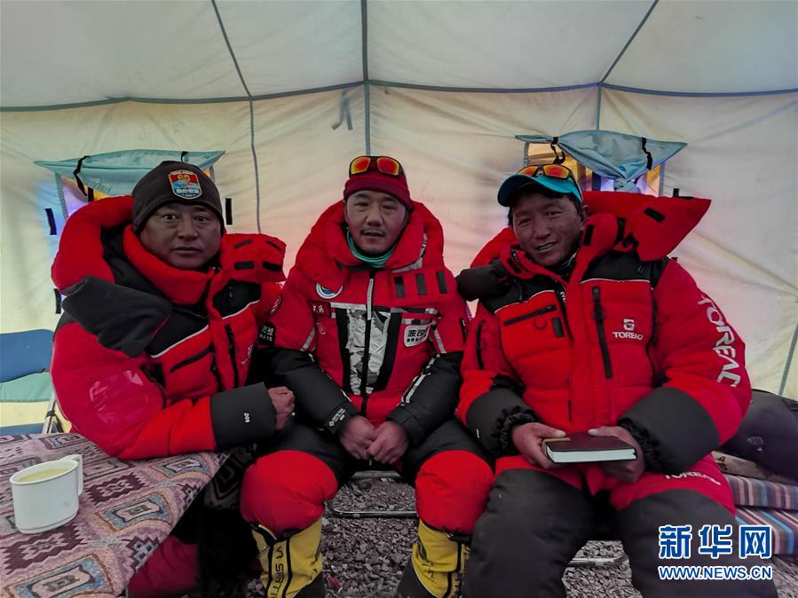 5月7日,在海拔6500米的珠峰前进营地,测量登山队队长次洛(中)与旺青索朗(左)、鲁达(右)在协调会议现场。新华社特约记者扎西次仁摄