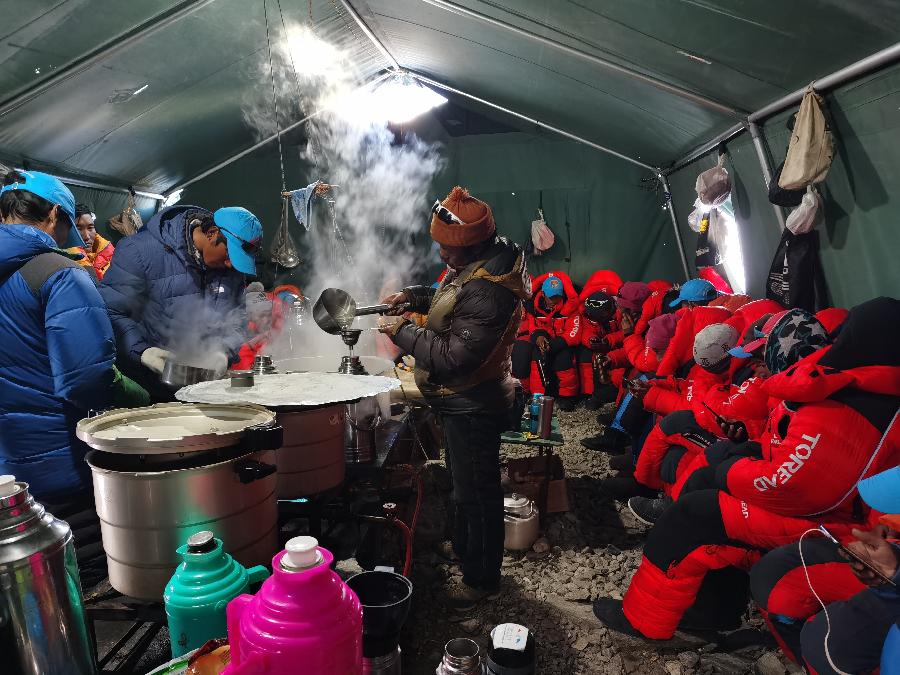 在海拔6500米的珠峰前进营地召开的前方工作协调会(5月7日摄)。新华社特约记者边巴摄