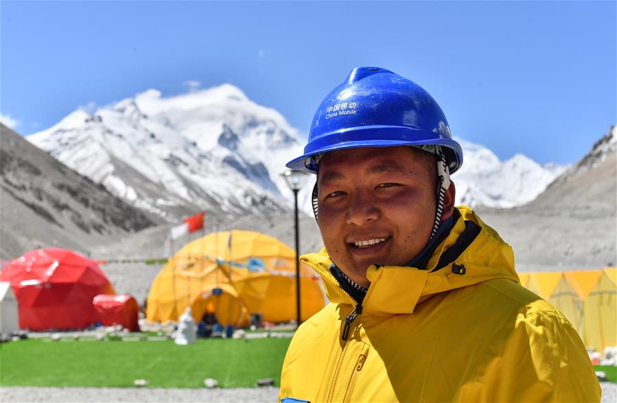 中国移动西藏公司员工土旦顿桑在珠峰大本营(5月8日摄)。5月8日是世界微笑日。在海拔5200米的珠峰大本营,参与2020珠峰高程测量的各方人员,微笑期待本次测量活动的圆满成功。