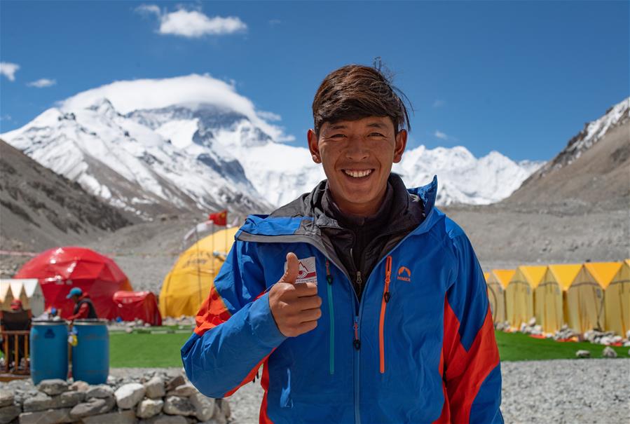 西藏圣山公司高山向导米玛顿珠在珠峰大本营(5月8日摄)。5月8日是世界微笑日。在海拔5200米的珠峰大本营,参与2020珠峰高程测量的各方人员,微笑期待本次测量活动的圆满成功。