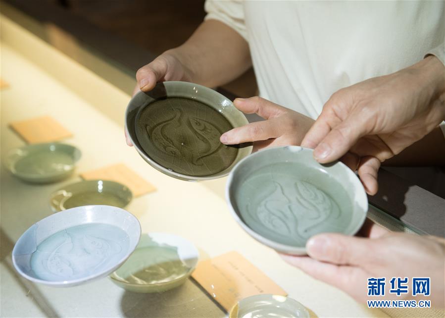 5月8日,“90后”瓷人汤佳(左)将自己制作的鱼纹盘带到龙泉青瓷装饰纹样研究所,跟项宏金收藏的古瓷器比对。1965年出生的项宏金,被浙江龙泉年轻一代瓷人称为“项哥”,他从20世纪90年代开始收集龙泉青瓷标本,研究青瓷纹样。2014年出版著作《龙泉青瓷装饰纹样》,次年开设龙泉青瓷装饰纹样研究所,将自己收藏的千余件标本跟瓷器爱好者、创作者免费分享。新华社记者翁忻旸摄