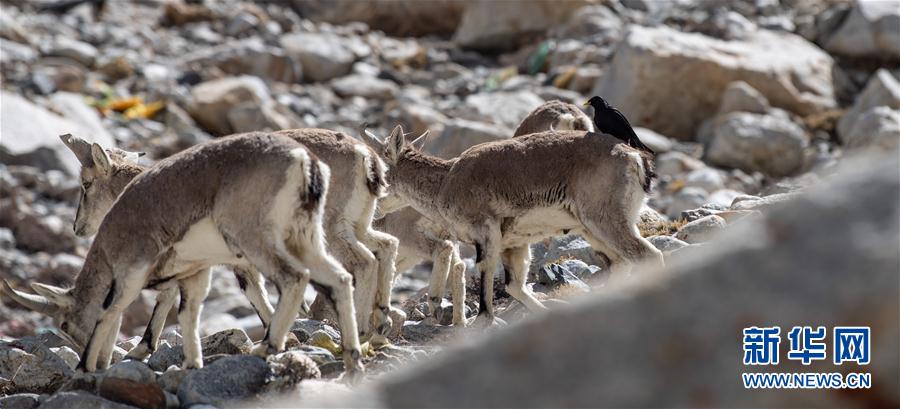 黄嘴山鸦停在岩羊背上(5月8日摄)。当日,一群岩羊在珠峰大本营周围觅食,黄嘴山鸦飞到岩羊身上停留,构成一幅幅生动有趣的雪域图画。新华社记者普布扎西摄
