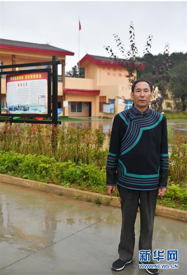 彝海结盟纪念馆管理员沙马依姑在彝海村前留影(2019年9月7日摄)。新华社记者孙瑞博摄