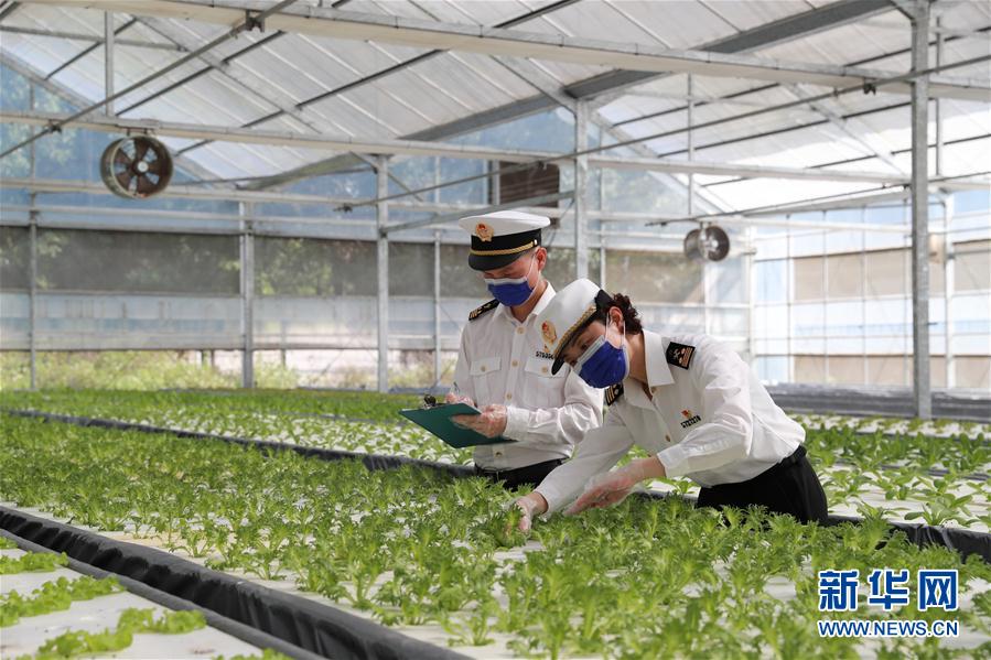 5月7日,在供澳水培蔬菜种植基地内,拱北海关所属香洲海关关员巡查基地,检查蔬菜的生产记录、病虫害防治情况。新华社记者卢烨摄