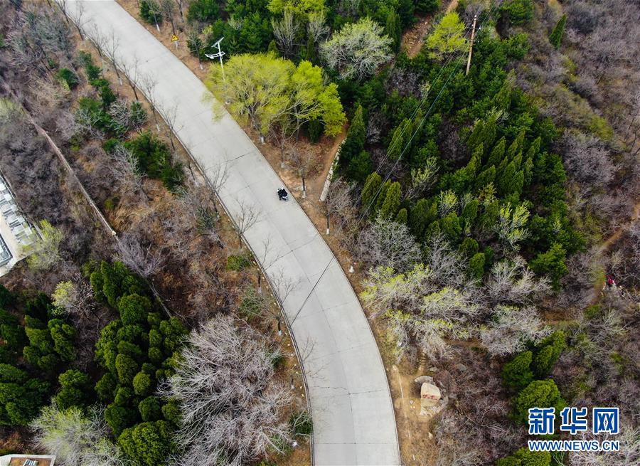 在山西阳泉,张明夫妇在前往志愿服务的路上(4月8日摄,无人机照片)。新华社记者马志异摄
