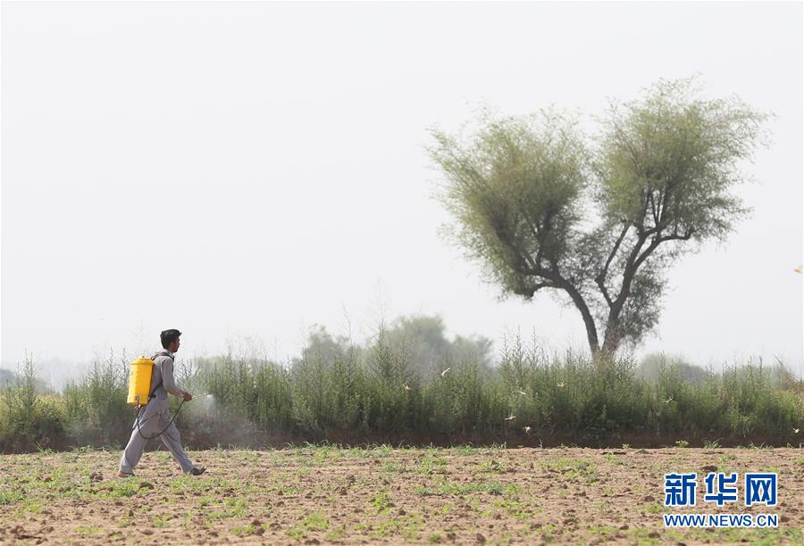 5月9日,在巴基斯坦旁遮普省杰格瓦尔地区,一名工作人员在田间喷洒灭虫剂。据巴基斯坦媒体报道,该国旁遮普省和信德省一些地区近期再次遭遇沙漠蝗虫侵袭,当地政府已组织民众进行紧急消杀。新华社记者 刘天 摄
