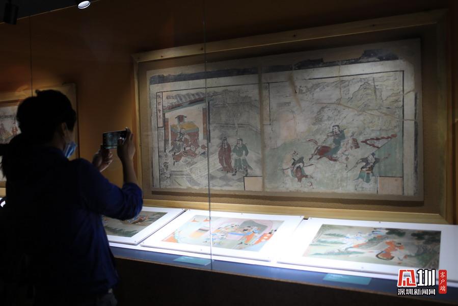 2020年5月10日报道,近十年来最大规模三国文物展“三国志——文化主题特展”,正在中华世纪坛展出。图为观众在看关公壁画。