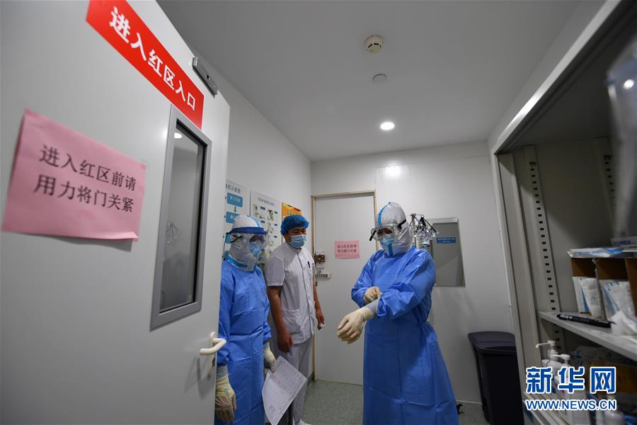 5月11日,在空港医院隔离病房,穿戴好防护服的医护人员准备进入“红区”。