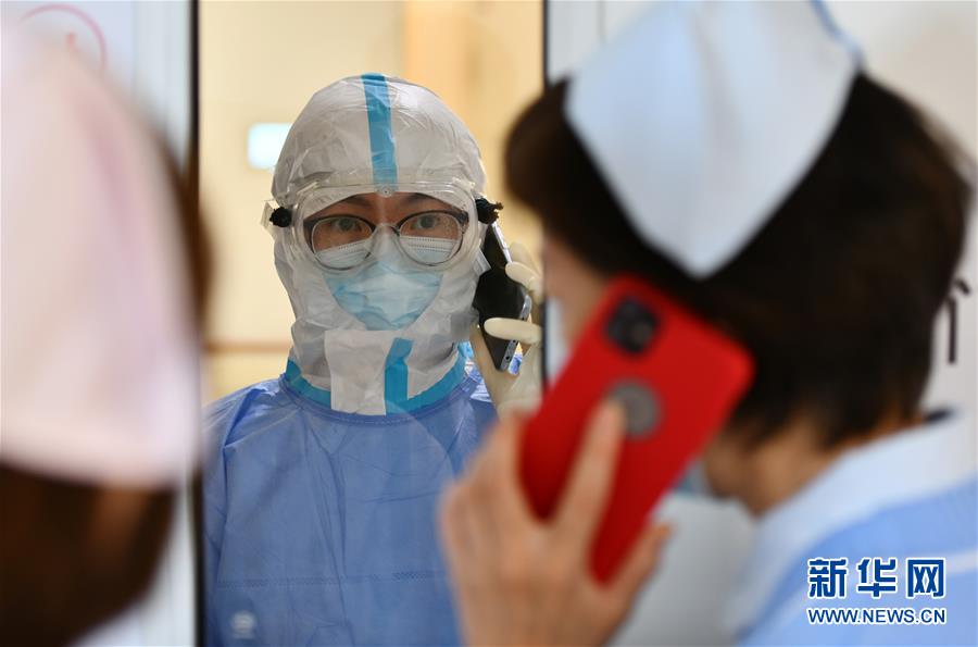 5月11日,在空港医院的隔离病房,身处“红区”的护士(中)和同事通话。新华社记者李然摄