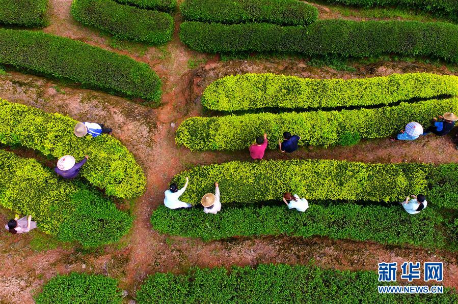 游玉琼和方舟带着公司员工抓紧采摘武夷岩茶中的白鸡冠品种(无人机照片,5月10日摄)。新华社记者魏培全摄